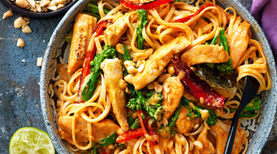 Soak the rice noodles according to packet instructions. Drain and set aside. Heat the oil in a wok over high heat. Add the spice mix and fry for five seconds. Add the chicken strips in batches and stir-fry until browned. Toss in the capsicum, broccolini and baby corn and cook for three minute. Stir in the curry paste and coconut milk sachet along with ½ cup water. Bring to a simmer and cook for two minutes or until the chicken is cooked and sauce has thickened. Add the drained noodles and toss to coat. Serve immediately topped with chopped roasted peanuts. Squeeze over the lime juice and serve with extra lime wedges.