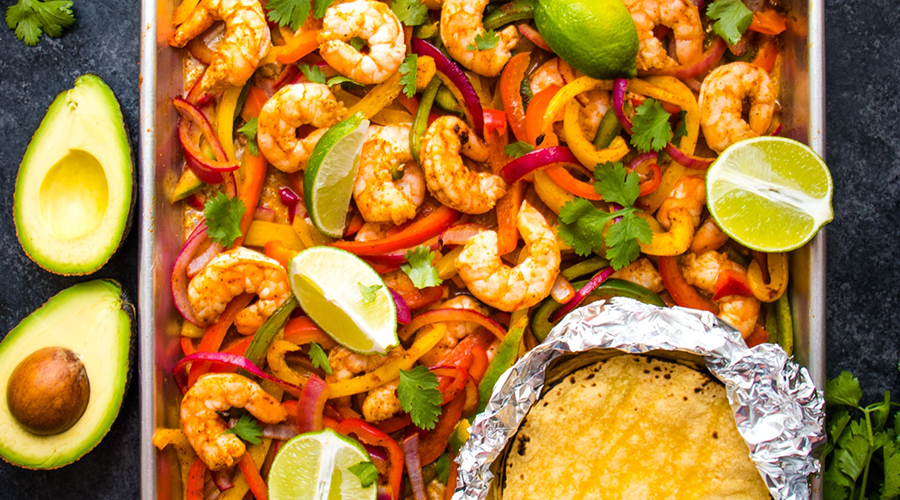 Preheat the oven to 200°C. Set the sheet pan close by. Juice one and a half of the limes. Cut the other lime half and set aside. Toss the bell peppers and onion into two teaspoons of oil until coated. Scatter them onto the sheet pan. Pour the lime juice and garlic into a blender, adding in the remaining oil in a steady stream. Add the salt and spices, pulsing once to combine. Marinate the shrimp, tossing to coat for 15 minutes. Meanwhile, roast the bell pepper and onion for 10 minutes. Remove the shrimps from the marinade. Polka dot the shrimp onto the sheet pan of roasted veggies. Roast for 10 minutes until fragrant. Set out the Mexican sour cream to serve with the lime wedges.