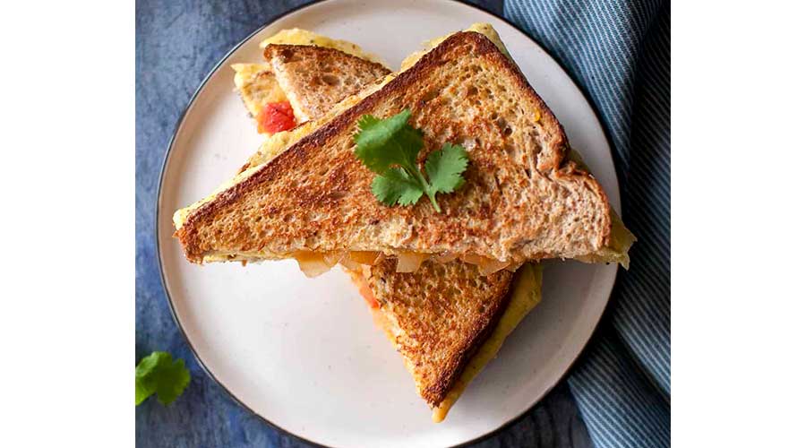 Brush butter in a pan and toast the bread slices from both sides on medium heat. Use a grill pan to get marks on the toast. Cut the omelette into pieces and layer it properly on bread slice to make a sandwich. Cover with other bread slice. Now dip the sandwich into the remaining egg mixture. Brush the pan with butter and fry the sandwich again to give it a sharp toasted colour and visible grill marks from both sides. Omelette sandwich is ready. Serve the sandwich with hot coffee or tea.