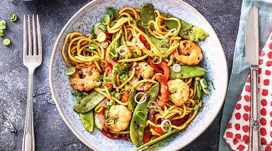Cook the noodles, broccoli and corn in boiling water for five minutes, or until tender. Drain and set aside. Heat the oil in a frying pan and fry the pepper for three minutes, until starting to soften. Tip in the noodles and vegetables along with the prawns and toss together. Add the sauce ingredients and heat everything through for two minutes, until piping hot.