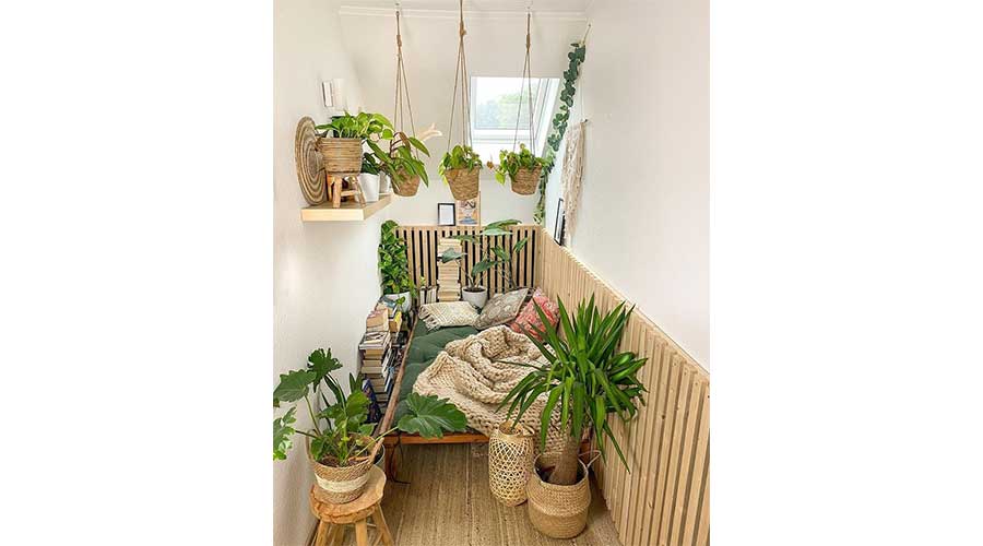To get this look, surround a comfortable chair or daybed with a variety of plants of various sizes, and keep a stack of your favourite books close by.
