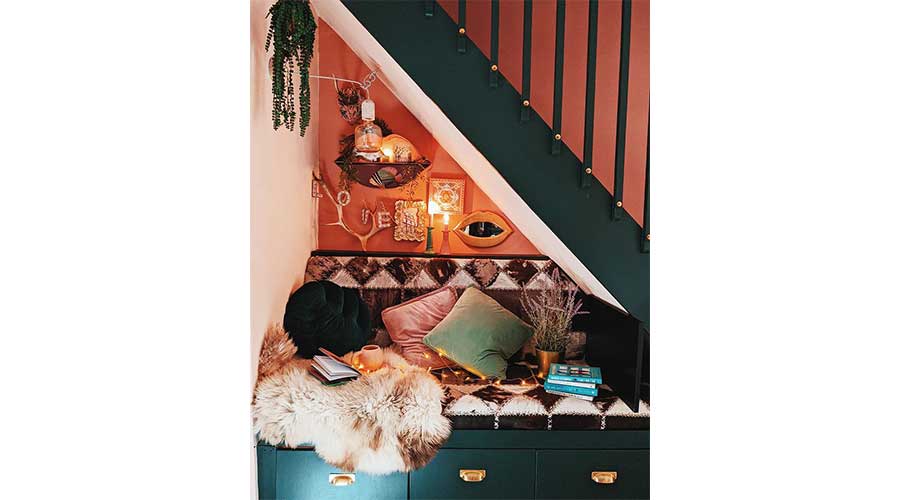 The oddly formed space under the stairs, the ideal hiding place for grownups, can be used to catch up on reading.
