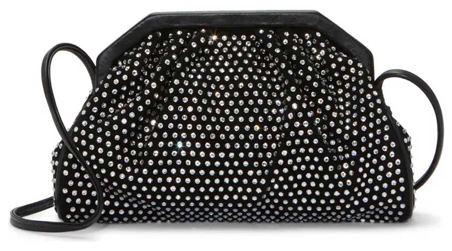 1. Shimmering jewel embellishments illuminate the creamy suede exterior of this soirée-ready Vince Camuto clutch fitted with a strap.