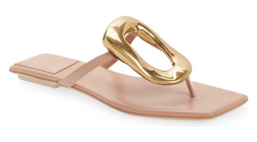 9. A polished link-shaped buckle tops this sleek Jeffrey Campbell flip-flop crafted from smooth leather.
