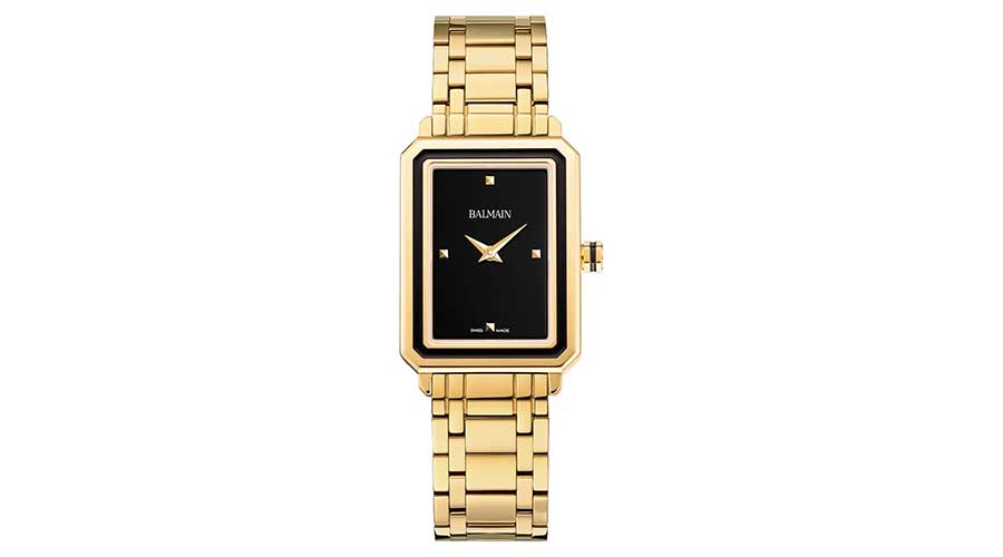 5. A sleek, instant classic, this deco-inspired Balmain bracelet watch features a rectangular framed case with a classy black dial.