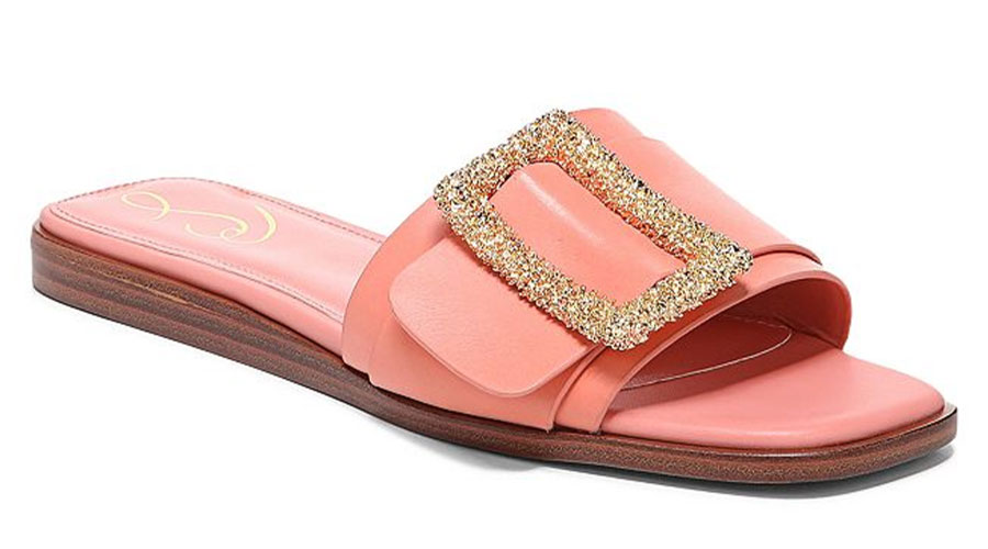 9• A chunky textured buckle on the wide vamp strap amps up the drama of this Sam Edelman square-toe slide sandal with a sophisticated low profile.