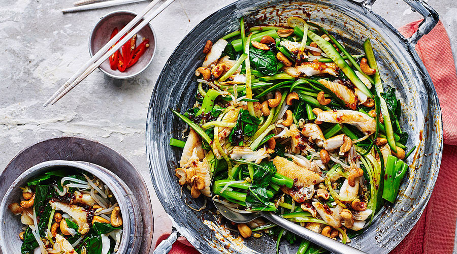 Toast the cashews in a dry wok or frying pan, tossing, until browned. Tip onto a plate and set aside. Mix the cornflour with the soy sauce to make a paste, then add the oyster sauce, vinegar and honey. Heat the wok until very hot. Add the oil, swirl it around to cover the base of the pan, then use tongs to place the steak pieces in the wok in a single layer. Cook without turning for one-two minutes, until a dark crust starts to form on the meat. Add the ginger and garlic, give everything a quick stir, then add the mangetout and the sauce. Cook for another one-two minutes until the beef is just cooked through and the sauce is thick and glossy. Sprinkle over the cashews and serve with rice or noodles.