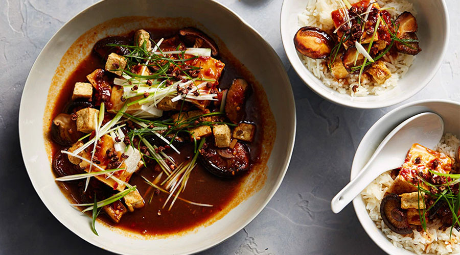 Drain the tofu and press gently with kitchen paper to remove any excess moisture. Slice into small sized chunks. Mix all of the sauce ingredients together in a jug. Heat a wok over a high heat and drizzle in the rapeseed oil. Add the garlic, ginger and chillies and stir for a few seconds. Tip in the mushrooms and stir-fry for a few seconds, then add the Sichuan pepper and the tofu, gently stirring. Add the chilli bean paste and dark soy sauce, followed by the Shaoxing rice vinegar. Pour in the sauce ingredients, stir everything to combine, and bring to bubble, cooking for one minute. Transfer to a serving plate and sprinkle over the ground toasted Sichuan pepper and spring onions to serve.