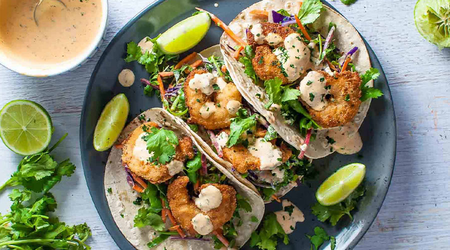 Toss the cabbage in a bowl with a large pinch of sea salt and the juice of two of the limes. Set aside for 10 minutes to slightly pickle. Mix in the sliced radishes and most of the coriander. Meanwhile, mash the avocado in a bowl with the remaining lime juice, salt and ground black pepper. Heat a griddle pan until hot. Toss the prawns in a bowl with the fajita spice mix and oil, then cook for two minutes on each side or until cooked through. To serve, warm the tortillas in the microwave, then top with the soured cream, pickled veg, mashed avocado, prawns and remaining coriander.