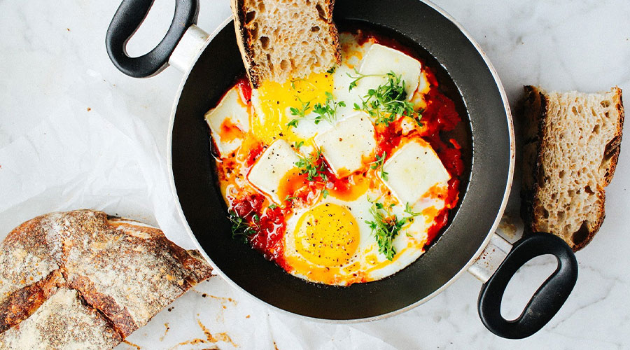 Heat oil in a skillet and add diced onion and crushed red pepper flakes. Cook for five minutes, stirring often. Add minced garlic and cook for a minute. Add the tomatoes and cook for 20 minutes, while stirring. Season it with salt, pepper and a bit of sugar. Make wells in the tomatoes with back of the spoon. Crack an egg into each well and cover with a lid. Cook until the egg whites are set and the yolks are still soft. Season the eggs with salt and pepper, to taste. Top with slices of brie and fresh parsley. Serve with grilled sourdough bread.